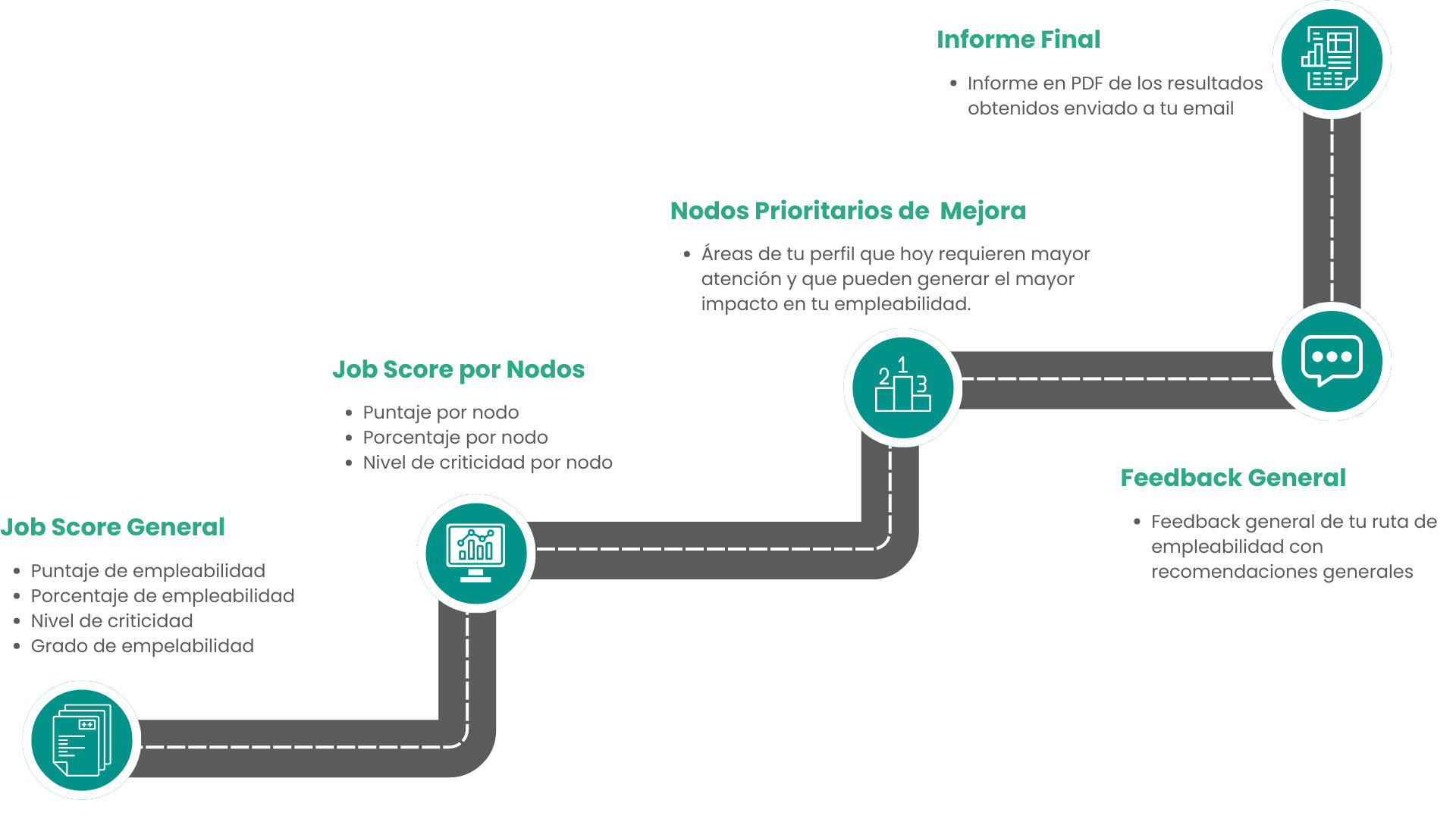 Jobs Score General: Es una puntuación integral que refleja tu nivel de empleabilidad actual. Analiza tus respuestas en todos los nodos y te muestra: Tu puntaje total (de 0 a 100), el porcentaje de evolución alcanzado, tu nivel de criticidad (bajo, medio o alto) y tu grado de empleabilidad. Con esta métrica vas a poder medir con claridad dónde estás hoy y qué tan preparado/a estás para el mercado laboral.